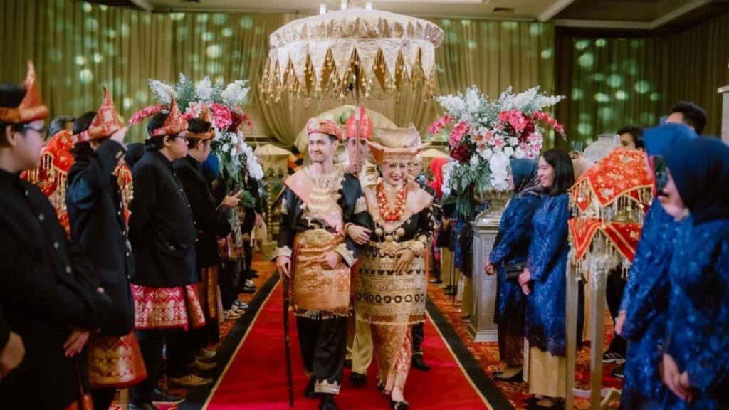 Minangkabau weddings offer a unique perspective because the culture is matrilineal. In this tradition, the bride’s family plays a dominant role, and the groom symbolically enters the bride’s household. The bride’s elaborate headdress, often shaped like buffalo horns, represents strength, dignity, and heritage.