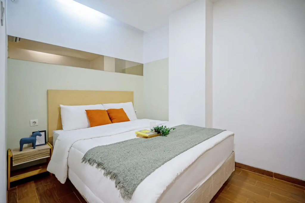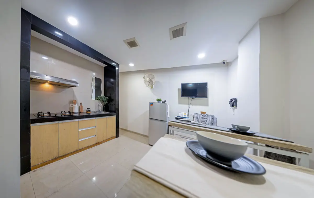 - Fasilitas unit: Kamar fully furnished, kamar mandi dalam, shower, WiFi, dapur, parkir mobil dan motor, CCTV, laundry 12 kg per bulan, layanan pembersihan kamar 2 kali seminggu