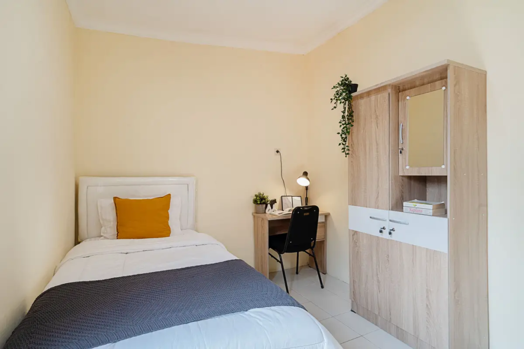 Nggak hanya lokasi strategis dekat fasilitas kesehatan, Rukita Wisma Cakung juga menyediakan hunian supernyaman. Kamarnya memiliki desain modern yang hangat dengan nuansa warna cokelat dan putih.