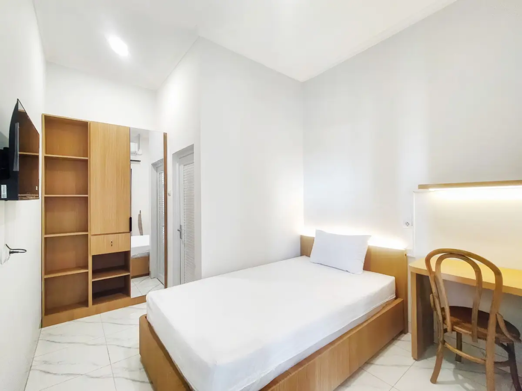 Kamar dilengkapi dengan tempat tidur, lemari, meja kerja, serta AC untuk menjaga suhu tetap nyaman. Tersedia juga kamar mandi dalam yang membuat privasi lebih terjaga.