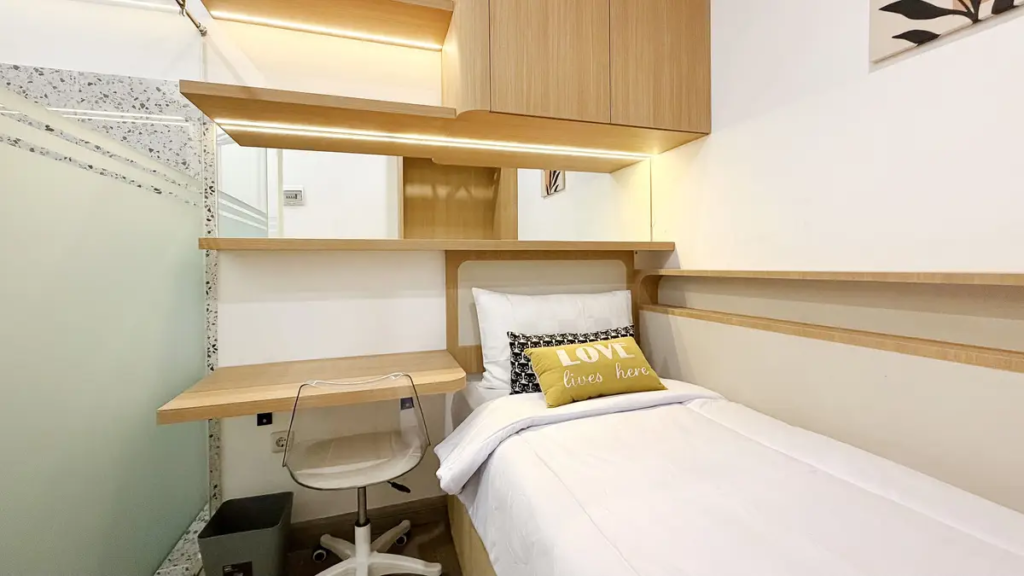 Tipe kamar yang tersedia yaitu Pocket Single dan Reguler Loft Queen. Kamu bisa pilih sendiri tipe mana yang paling sesuai dengan kebutuhanmu. FYI, untuk tipe kamar loft bisa dihuni oleh dua orang sehingga cocok juga buat pasutri yang sedang merantau di Makassar.