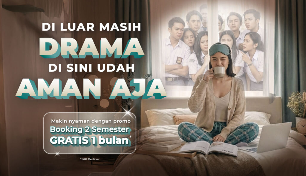 Salah satunya promo khusus maba! Kalau bayar 3 bulan diskon 6% (hingga Rp690.000), 6 bulan diskon 8% (hingga Rp1.500.000), atau 12 bulan diskon 10% (hingga Rp3.600.000), atau booking 2 semester jadi gratis 1 bulan sewa!