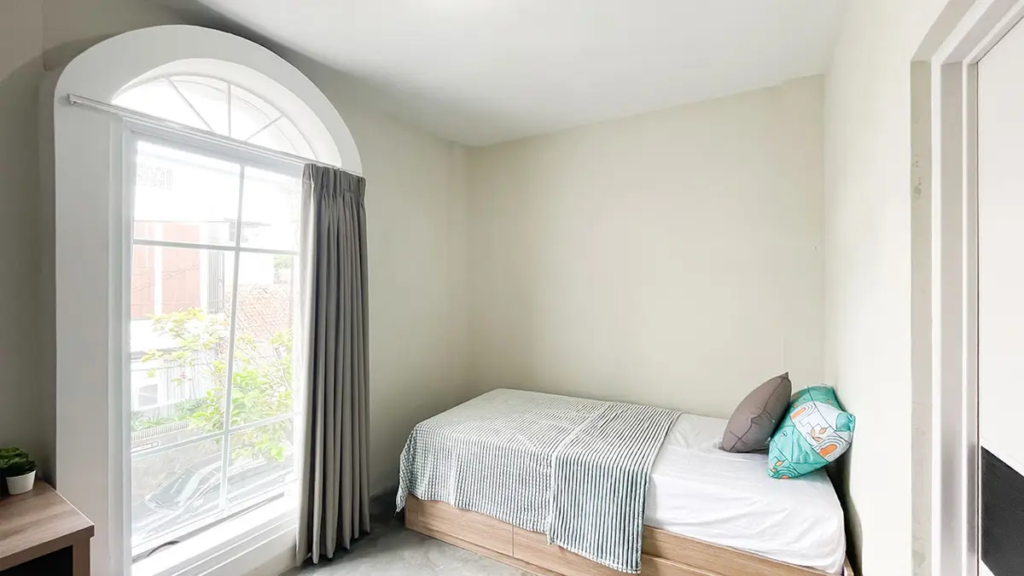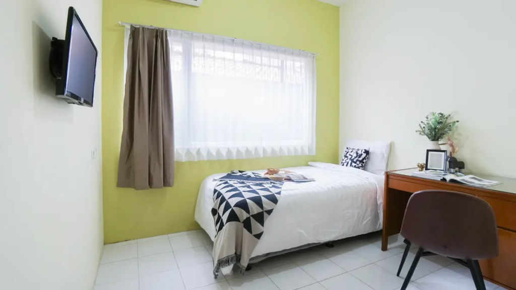 Kamarnya sudah fully furnished, lengkap dengan kasur, AC, Wi-Fi, lemari, meja, kursi, kamar mandi dalam, dan ada pula yang dilengkapi TV. Ingin tinggal berdua bersama teman? Bisa banget! Kost putri di Depok ini juga tersedia kamar yang terdapat 2 single bed.