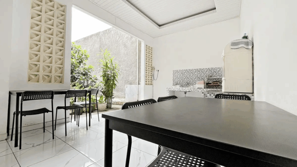 Setiap kamar di Rumah Biru Jatiwaringin sudah fully furnished, dilengkapi AC, WiFi, serta kamar mandi dalam dengan shower, wastafel, dan toilet duduk. Fasilitas bersama mencakup dapur lengkap dengan peralatan masak, meja makan, area komunal, serta lahan parkir untuk kendaraan pribadi.