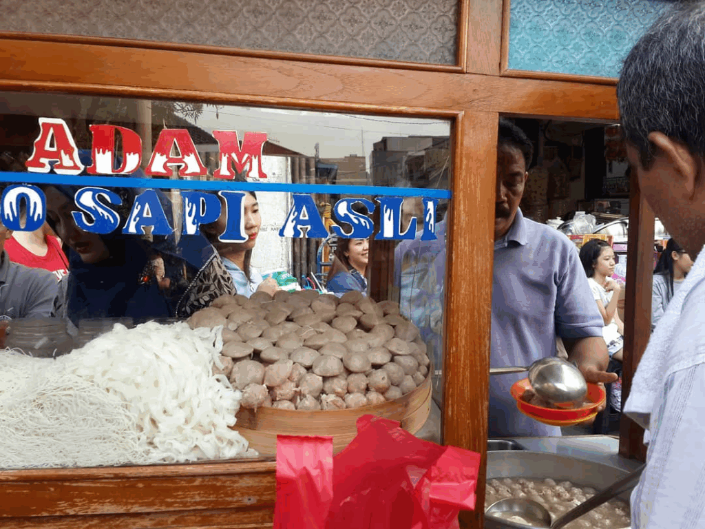 Banyak orang yang rela antre demi semangkuk Bakso Adam yang legendaris ini. Bukan berada di tempat yang mewah, Bakso Adam berada di gerobak sederhana yang mangkal di Pasar Glodok dan baru mulai berjualan pukul 16.00 WIB sore.