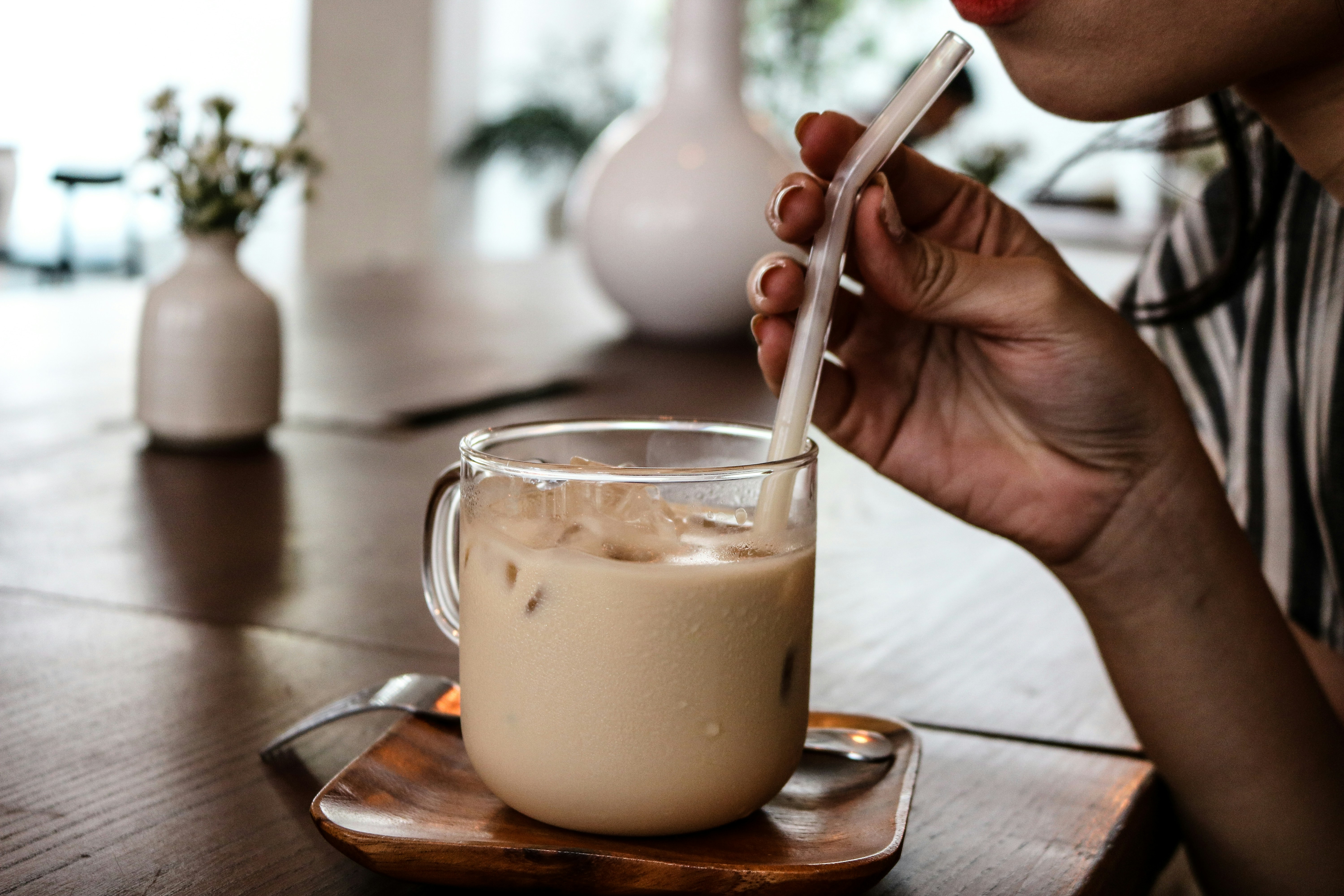 - Tuangkan susu putih cair ke dalam botol minum, kocok-kocok hingga berbusa.